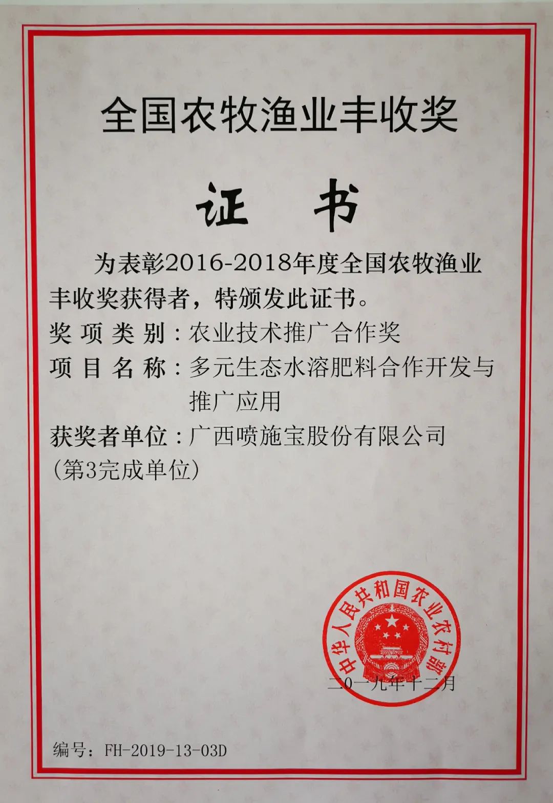 On December 19, 2019, Guangxi Penshibao Co., Ltd. received the certificate of the National Agricultural, Animal Husbandry and Fishery Harvest Award issued by the Ministry of Agriculture and Rural Affairs. Known as the "Oscar of the agricultural industry", the National Agricultural, Animal Husbandry and Fishery Harvest Award represents the highest honor in China’s agricultural sector. In 2019, the company’s project Cooperative Development, Promotion and Application of Multi-Element Ecological Water-Soluble Fertilizers won the First Prize – Cooperative Award for Agricultural Technology Extension of the National Agricultural, Animal Husbandry and Fishery Harvest Award. This is recognition and encouragement from the state for the company’s 35-year commitment to green and eco-friendly agriculture, as well as a fruitful achievement from long-term cooperation with numerous scientific research and extension institutions.